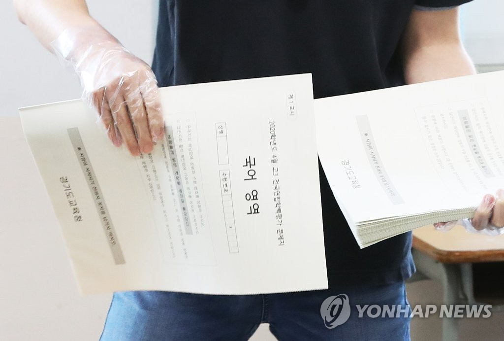 在首尔永登浦区汝矣岛高中,老师为同学分发答题卡和试卷。