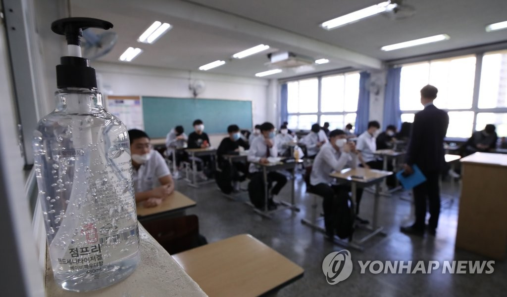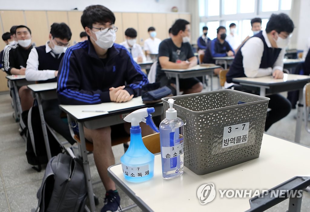 在首尔永登浦区汝矣岛高中,每间教室配备着一瓶手部消毒剂。