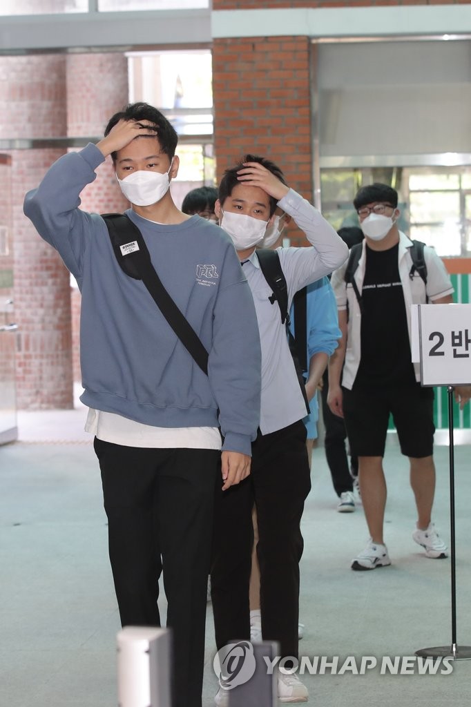 光州西区全南高中,学生们在进入教室前将额头露出来,接受体温检测。