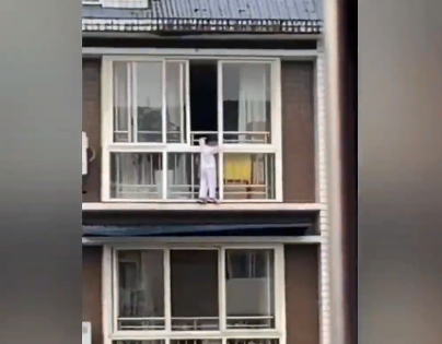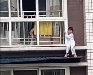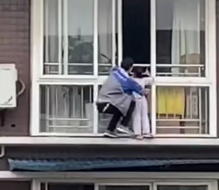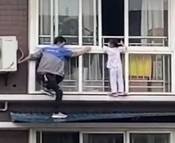 撬门无望,胡云川迅速来到五楼住户的阳台。现场视频显示,他翻出阳台,脚踩空调外机,沿着相邻住户的金属防盗栏爬到六层的高度,之后跨到女孩所在的阳台外侧,并把她抱回了房间里。整个过程只有几分钟。