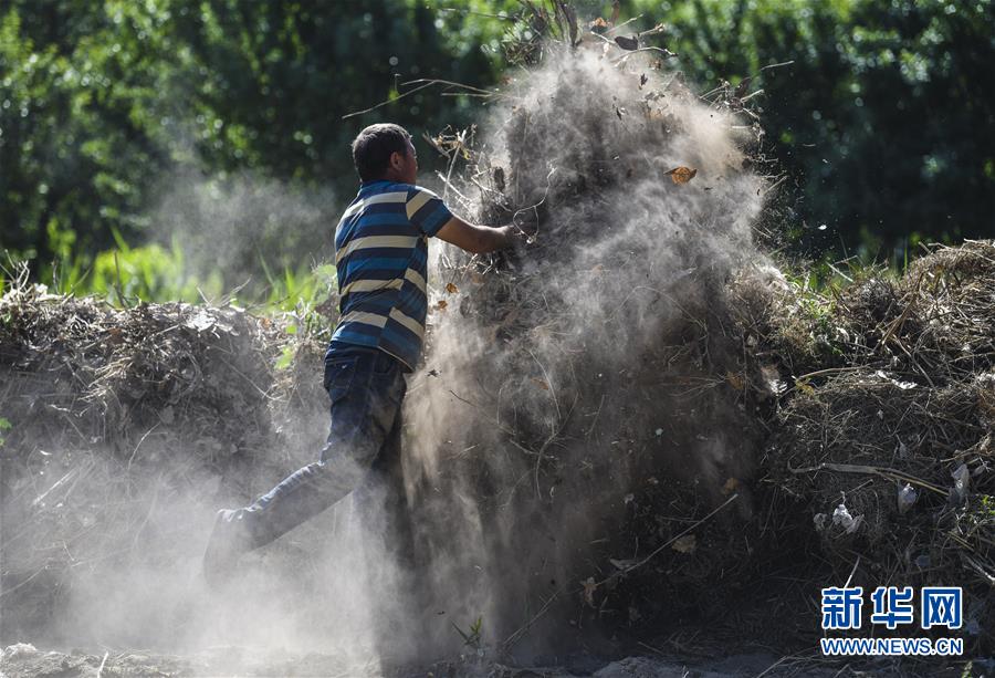 在新疆莎车县伊什库力乡阔坦墩村,一名农民在大田旁制作堆肥(5月22日摄)。新华社记者 王菲 摄