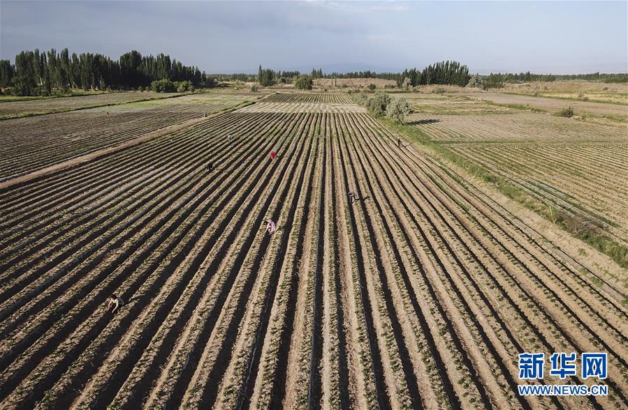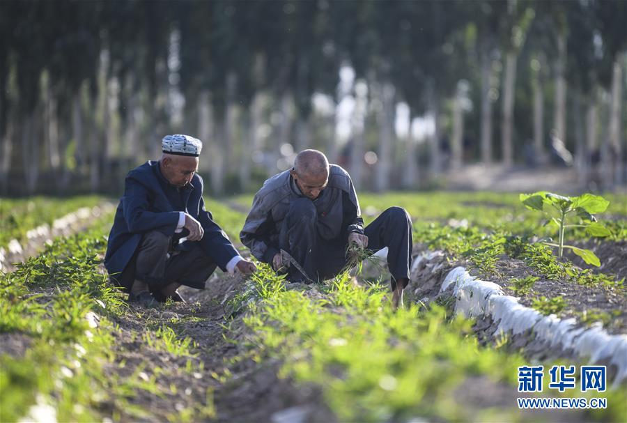 在新疆莎车县乌达力克镇博依拉村,农民在田间劳作(5月23日摄)。