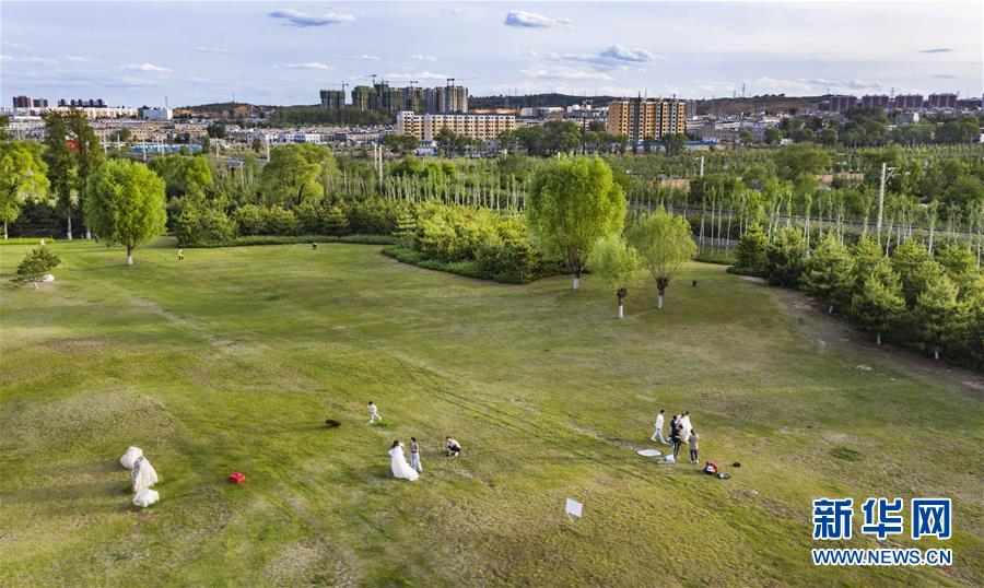 5月24日,市民在榆林市城市绿化带拍摄婚纱照(无人机照片)。 新华社记者 陶明 摄