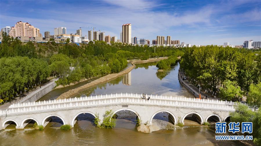 5月24日拍摄的榆林市榆溪河生态长廊(无人机照片)。 新华社记者 陶明 摄