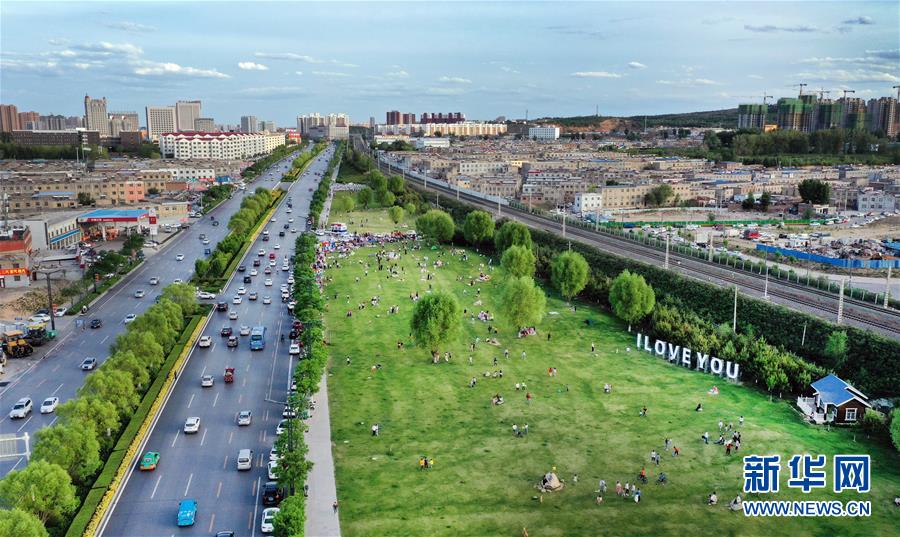 5月24日,市民在榆林市城市绿化带休闲(无人机照片)。 新华社记者 陶明 摄