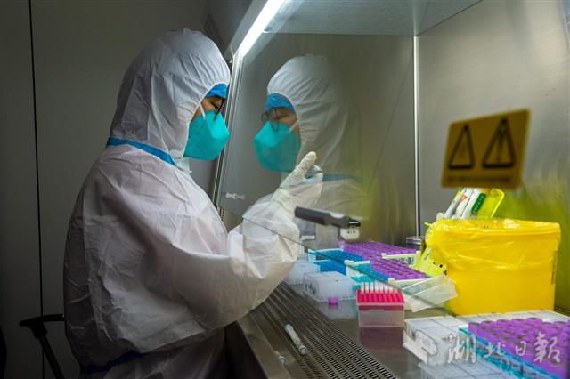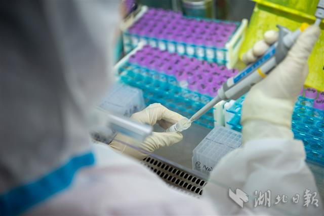 5月22日,武汉市第一医院检验科分子生物学实验室,检测人员正在制备标本。该院实验室是武汉市最早开展新冠核酸检测的医院实验室之一。随着武汉市集中核酸筛查工作接近尾声,该院核酸检测团队正加班加点处理、检测送检样本,日均检测量超过4000份。(湖北日报全媒记者 蔡俊 摄)