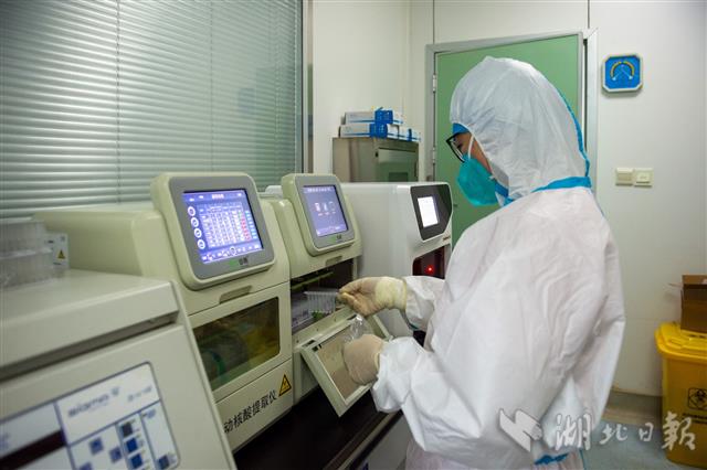 5月22日,武汉市第一医院检验科分子生物学实验室,检测人员使用全自动核酸提取仪提取待检样本核酸RNA。
