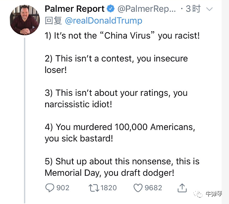 Chidi:100000+美国人死了,他又开始在“中国病毒”上胡扯,这是转移焦点,别上当……既然你那么在意功劳,那你的名字应出现在每个因此去世的美国人的死亡证书上,你赚的。