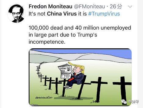Fredon Moniteau:这不是“中国病毒”,而是……10万人死了,4000万人失业,很大程度就是因为特朗普的无能。(请原谅,我少翻译了几个字,因为恐吓和谩骂不是战斗,我们也不想抹黑,亮点自己找)