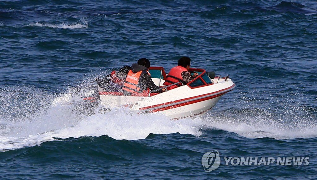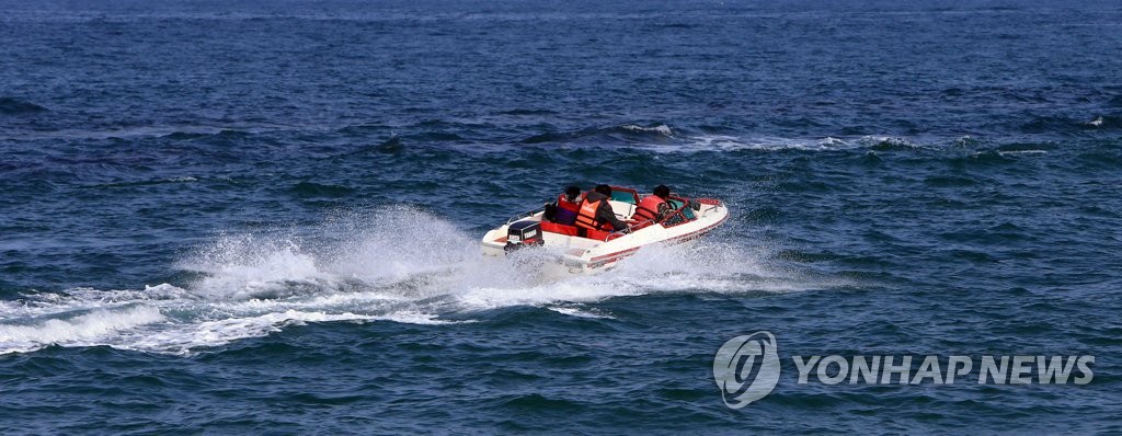 23日,在江原束草市束草海上,游客乘坐摩托艇掀起浪花,在海上奔驰。