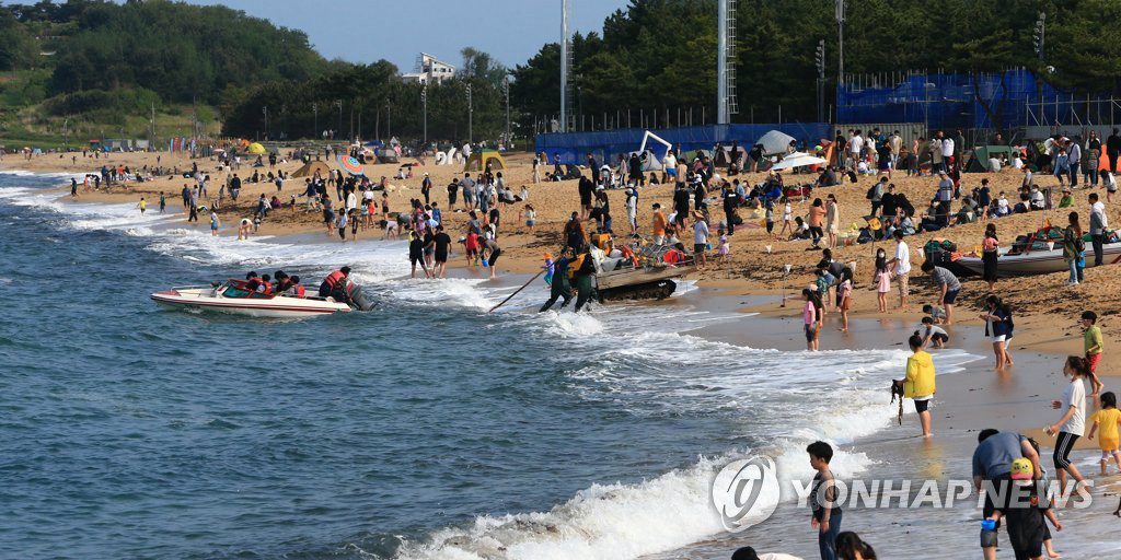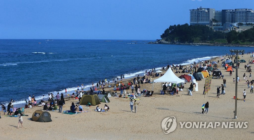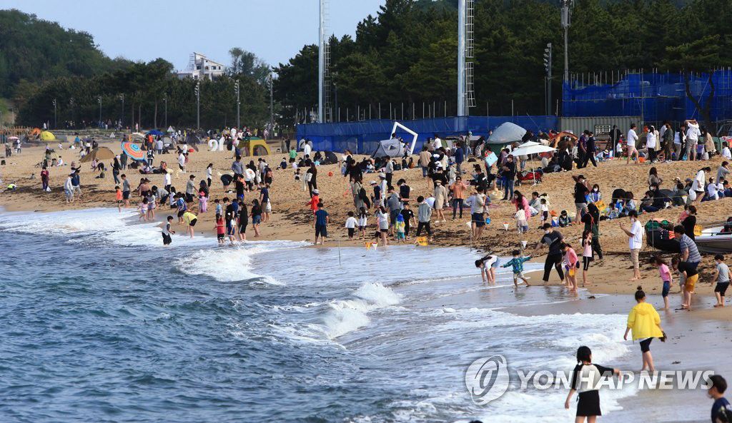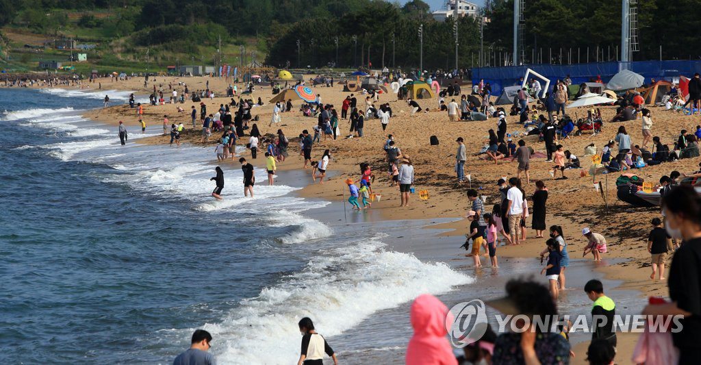 人民网讯 据韩联社报道,近日气温逐渐上升,越来越多的韩国家庭选择在周末驱车前往海滩消暑。23日,不少市民和游客戴着口罩,扎堆在束草海滩享受着周末美好时光。(图源:韩联社)