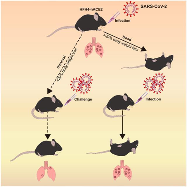 研究团队同时观察了新型冠状病毒感染小鼠的生存率情况,发现部分小鼠在感染后死亡,主要原因可能是人血管紧张素转化酶2在小鼠脑中表达所致。通过对感染存活小鼠和未感染过的小鼠进行高剂量攻毒,发现被感染过的小鼠可以免受病毒的致死性攻击。