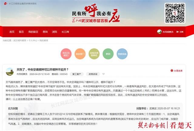 该条咨询被转给武昌区办理。武昌区卫健局工作人员给记者打来电话回复:遵循两个方面的原则,中央空调不是不可以开。同时,武汉城市留言板官方给出书面回复: