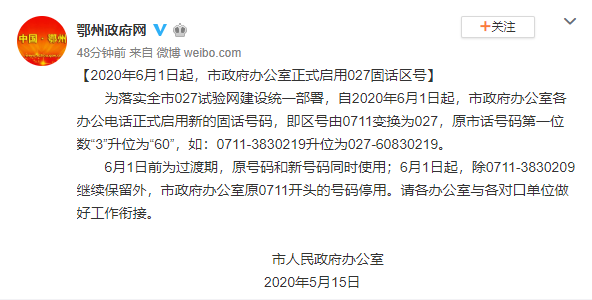 据@鄂州政府网官方微博消息,自6月1日起,鄂州市政府办公室各办公电话正式启用新的固话号码,即区号由0711变换为027。