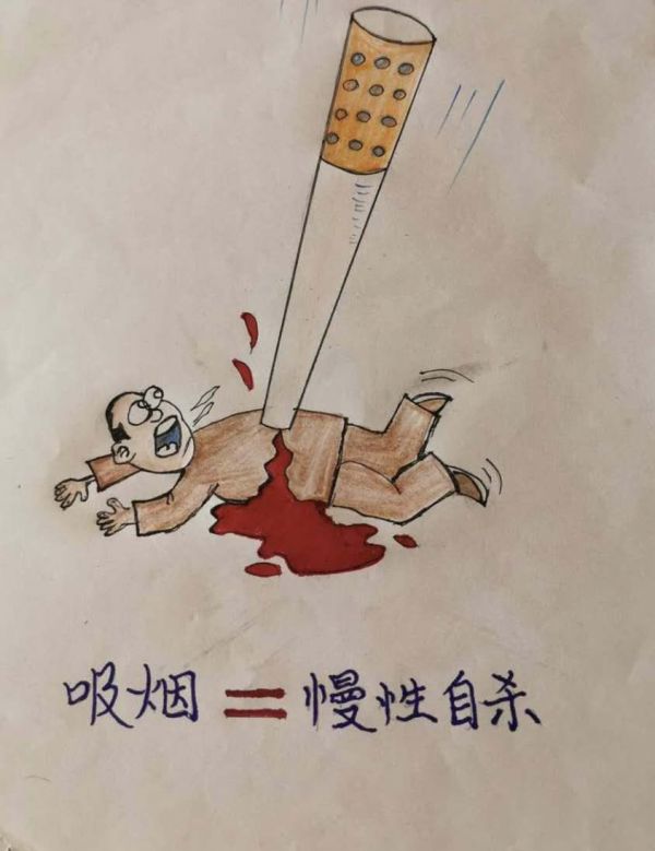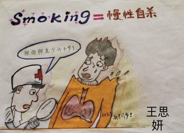“你吸烟的样子既不帅也不酷。”该校七(6)班学生王思妍在一组原创漫画《moking=慢性自杀》中,画了一位17岁的少年,少年在诊疗中得知自己的肺已经60岁时,一脸惊恐。她说,有数据显示,我国一半以上的吸烟者在20岁以前就开始吸烟,青少年吸烟问题不容忽视。