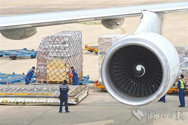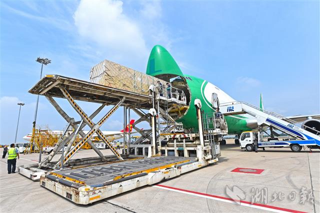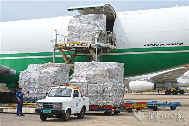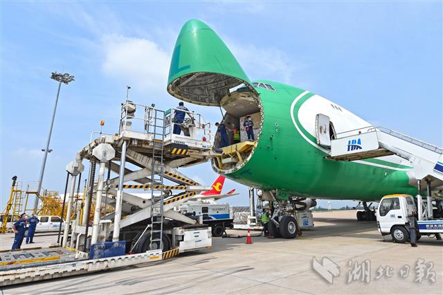 图为当日上午由比利时列日飞抵武汉的波音747-400全货机正在卸货。