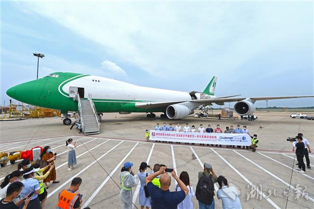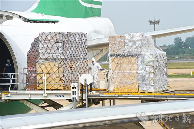 2020年6月2日,武汉天河机场开通至比利时列日全货运定期洲际航线,这是自4月8日天河机场复航以来恢复的首条洲际货运航线。图为当日上午由比利时列日飞抵武汉的波音747-400全货机正在卸货。(湖北日报全媒记者 李溪 摄)
