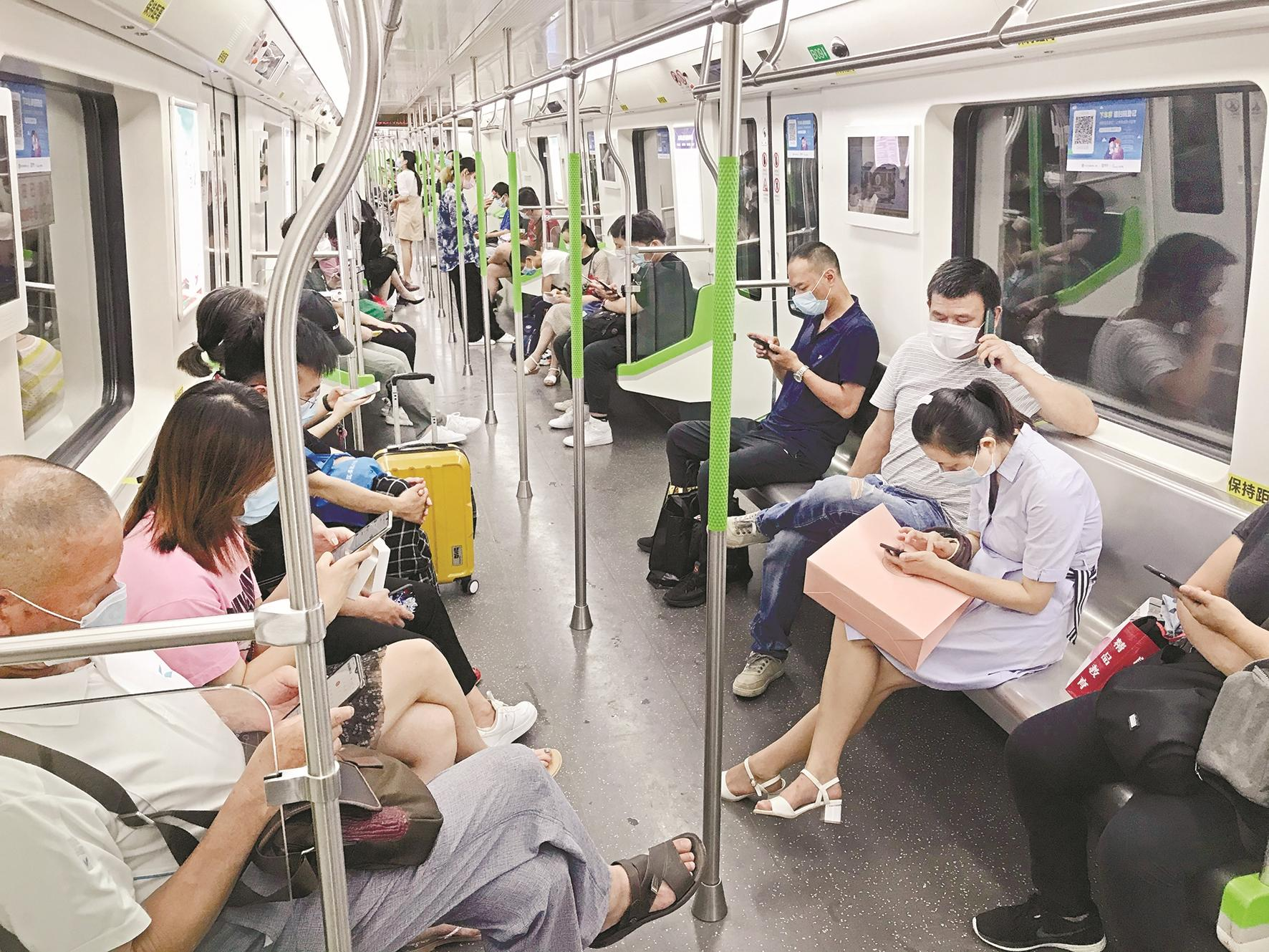 昨日下午记者乘坐4号线、2号线探访发现,列车上的乘客确实比此前探访时有所增加。记者在东亭站登上4号线发现,每节车厢都有多名乘客站着。座位上,普遍都坐着3至4名乘客。