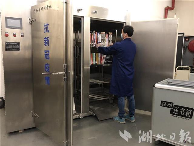 “一台这样的专用消毒柜,每次可以放800册图书,从图书上架、消杀、到取出,整个消毒过程2个小时左右,通过臭氧消毒,可以达到绿色灭菌,无死角。”李川介绍。目前,湖北省图书馆正在积极筹备开馆,为了解决图书借阅流通过程中存在的病毒传播风险,工作人员将针对开馆后借出归还的所有图书,进行专业消杀再行上架。同时,为了在恢复开馆之后,让读者放心借阅,在馆内1至3楼的主要阅览区,还安装了三台小型图书消毒柜,专供读者对借阅图书二次消毒使用,每次可放进6本图书,30秒完成消杀。