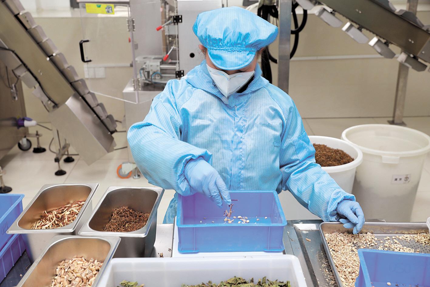 工人生产中药防疫茶包。