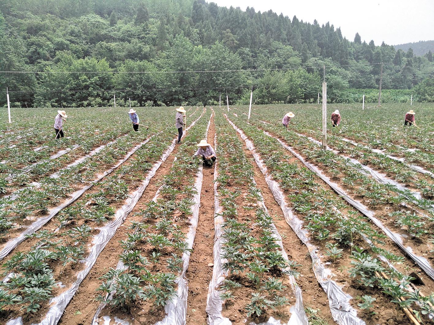 5月30日,宜昌夷陵区龙泉镇雷家畈村芍药基地,农民正在管护药草。