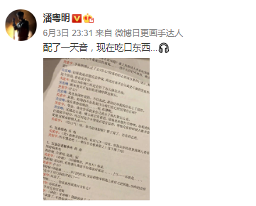 网易娱乐6月4日报道 6月3日晚,潘粤明在微博晒出自己配音台词本的照片,写道:“配了一天音,现在吃口东西...”只见纸上内容是《白夜追凶》中关宏峰关宏宇两兄弟的对话,网友看后纷纷惊呼:“天啊!!!这是第二部吗?!!!” “啊??怎么,在配白夜吗?”