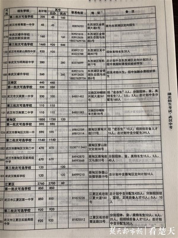 5日,武汉市2020年普通高中预安排招生计划出炉:全市普通高中计划招生4.12万人,比去年增加约0.2万人。其中,省级、市级示范高中计划招生3.4万人。据测算,今年初中毕业生就读优质高中的比例约为46%,与往年持平。