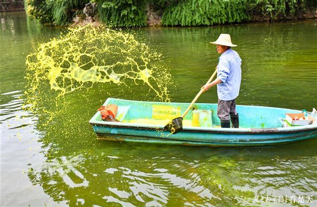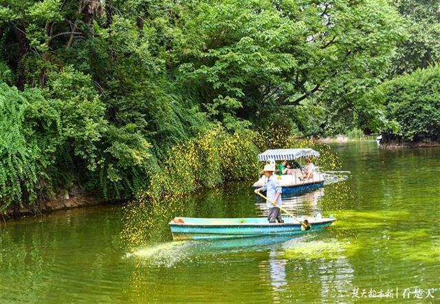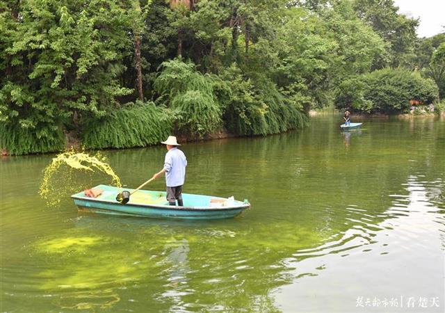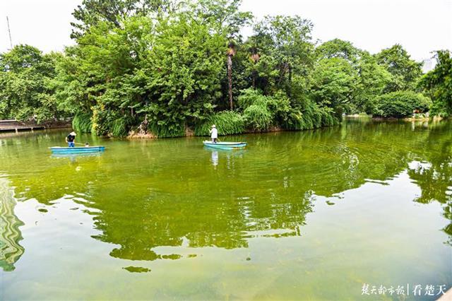 6月5日,武汉中山公园内,两男子驾船将黄色液体撒入湖中。据了解,黄色液体无毒无害,有助清除湖中苔藓。大树林立,湖水清澈,水草生长,鱼儿自由欢快游动。美丽的中山公园成为越来越多游客和市民养身休闲的好去处。(楚天都市报记者 王永胜 )