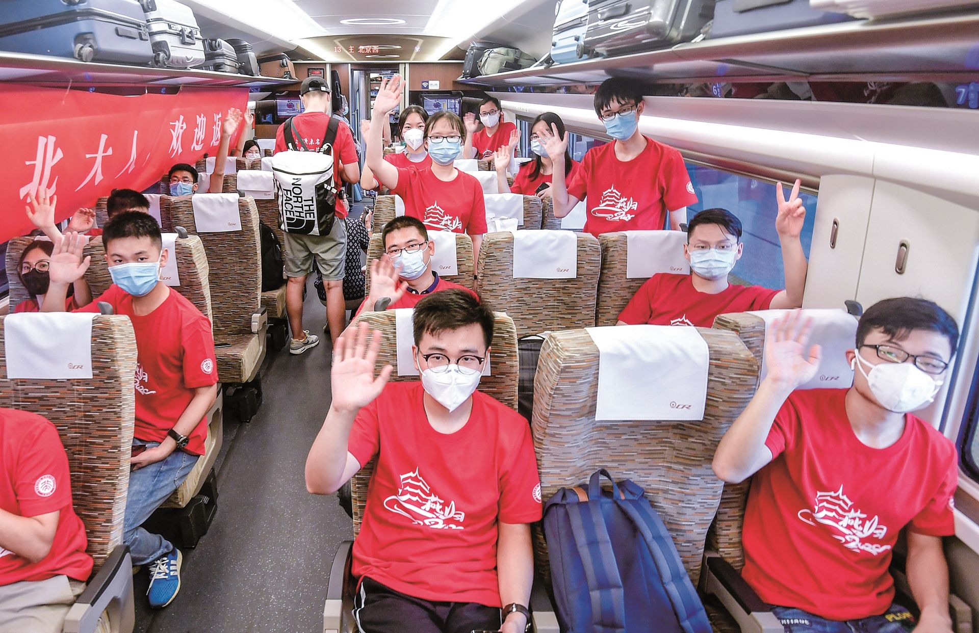 昨日下午13时30分,G516次列车从武汉火车站准时启动,首批百余名北大、清华的湖北籍大学生集体踏上返校旅途。在家困了四个多月后终于能回校了,学子们在车站欢喜相聚,合影留念。