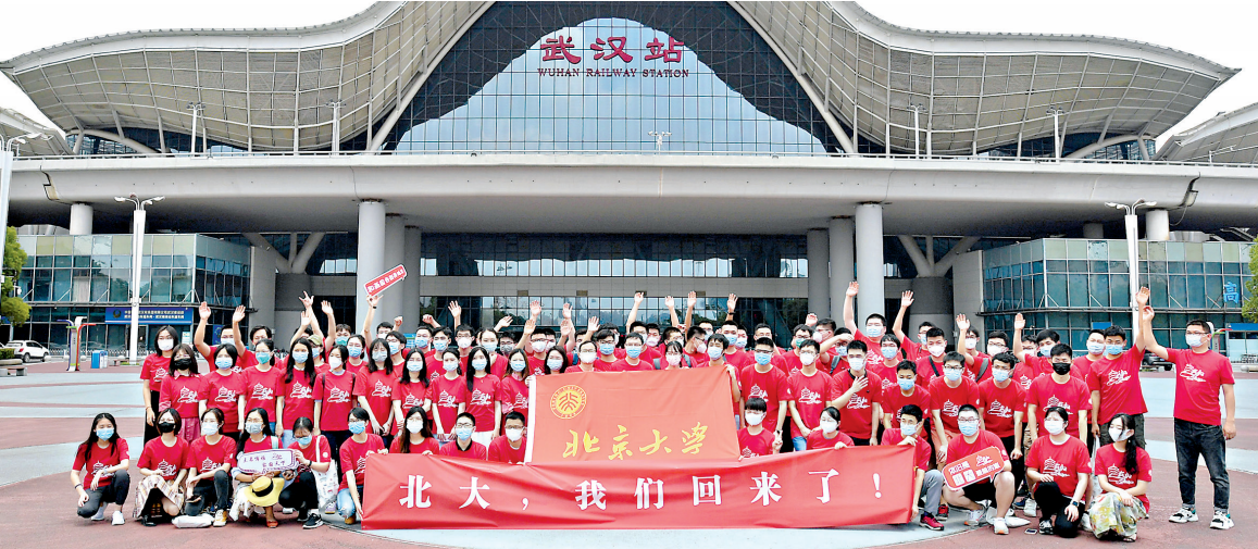 “北大,我们回来了!”百余名学生也穿着统一的T恤,在武汉站前合影留念。