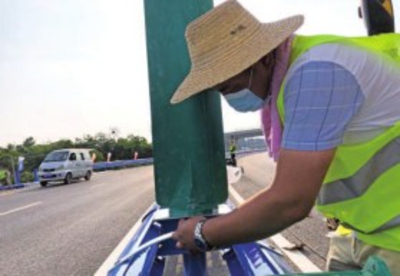 陶彪正在安装的防眩板,可以解决对向车灯眩光,是安装在高速公路中央分隔带上的一种交通安全产品。