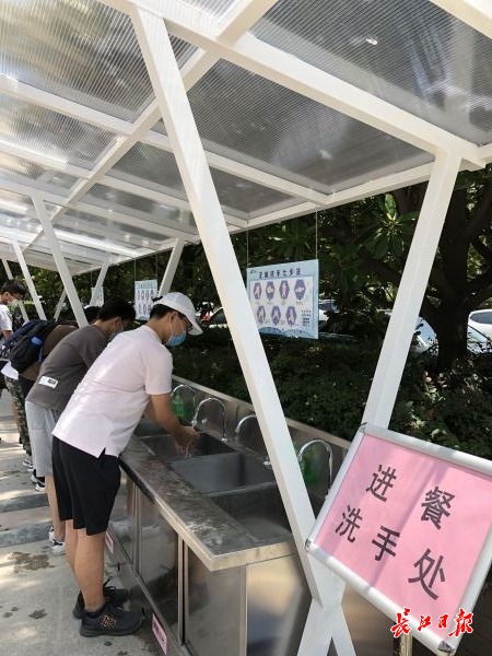 在餐厅门口,学校设置了一排洗手池,并提示大家:餐前要洗手。每两个水池中间放着洗手液,前来就餐者,只需要用脚踩地上按钮,水就会流出来,避免了手洗干净后再次按水龙头开关。