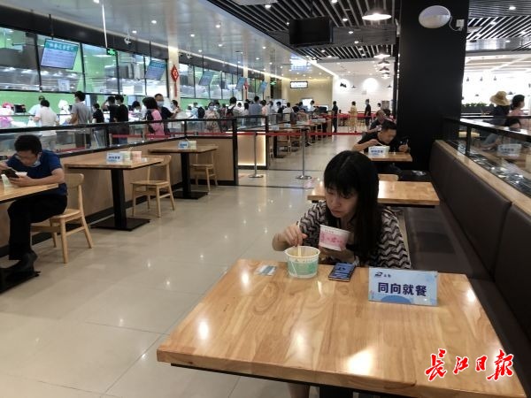 长江日报记者看到,整个就餐大厅很宽敞,每一桌和桌之间相隔一段距离,每张桌上正反写着各一行字“一人一桌”“同向就餐”。