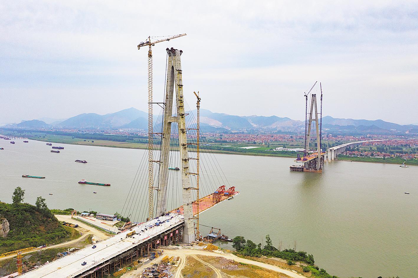 棋盘洲长江大桥下游30多公里处,“钻石型”斜拉桥武穴长江大桥正加快建设。 (省交投武穴长江大桥公司供图)