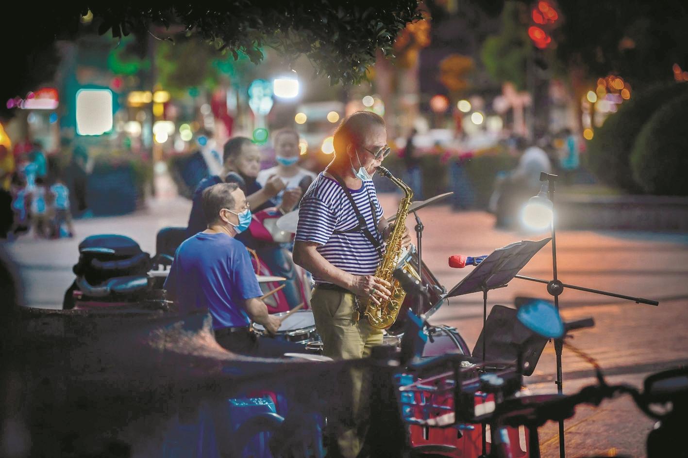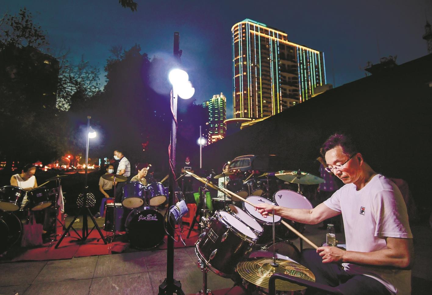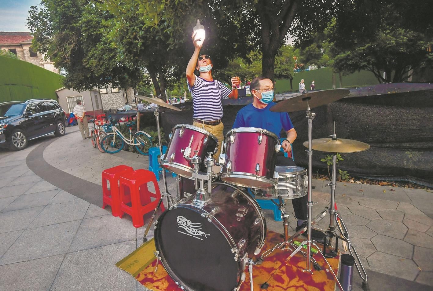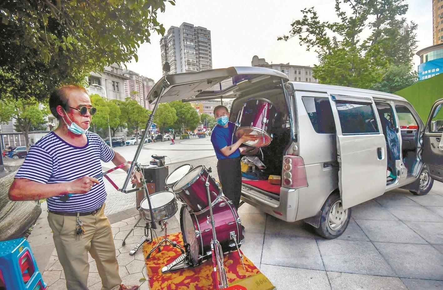 有半年没出门了,一起打架子鼓的乐队成员老杨、老韩、老方、老姜,大家都熬不住了。傍晚,大家约见在广场上时,相视一笑,支起鼓架,疫情期间的烦闷、平时独自一人的孤单、看着街道日渐热闹的欣喜,都咚咚咚地敲打出来。