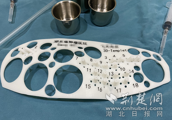 按照治疗计划,邓女士需要接受18个位点的放射性粒子植入。传统的植入术中,医师主要凭借个人经验进行穿刺和植入,往往找准一个点都需要多次穿刺和CT扫描。为此,在征得邓女士和家属同意后,医院放射科团队首次尝试了3D打印模板辅助碘125放射性粒子植入术。手术前,医疗团队根据邓女士的相关影像数据,为其量身定制了3D打印模板,其形状与手术部位完全贴合,上面已经将需要植入粒子的位点固定和标识好,并按照每个点穿刺的角度和深度预留好了针道。
