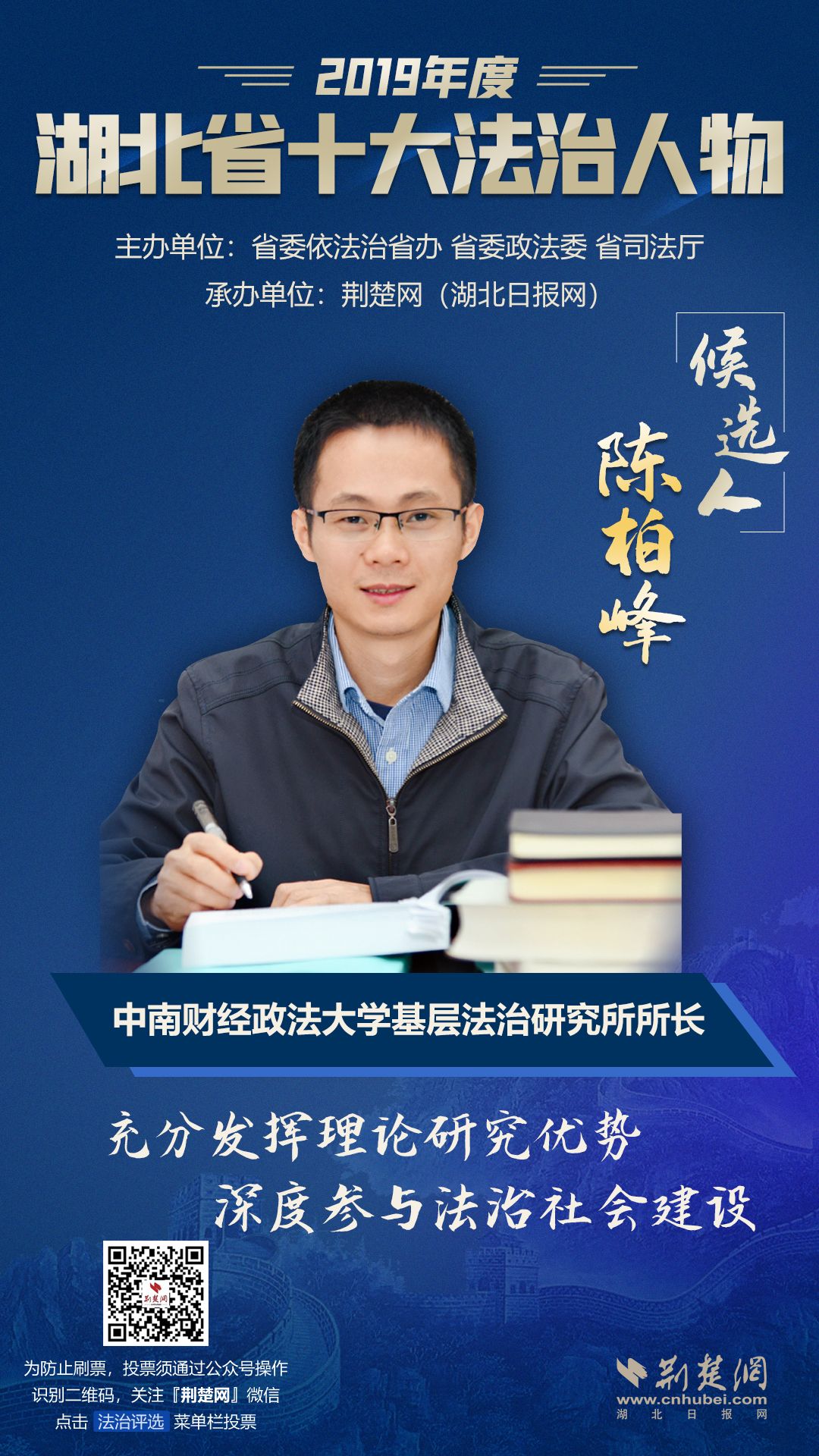 陈柏峰,男,1980年9月出生,中共党员,现任中南财经政法大学教授、人才办主任,是中南财经政法大学法治发展与司法改革研究中心的首席专家、中南财经政法大学基层法治研究所所长。