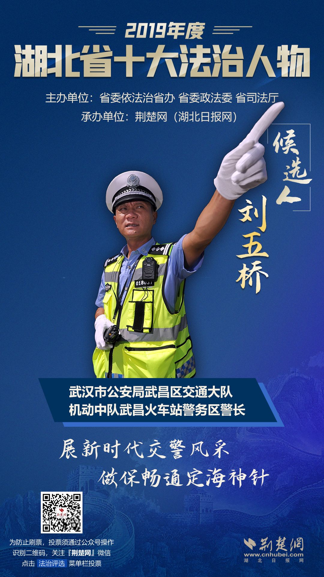 刘五桥,男,汉族,1970年11月出生,湖北武汉人,1992年11月加入中国共产党,1994年6月参加公安工作,大学学历,一级警督警衔,现任武汉市公安局武昌区交通大队机动中队武昌火车站警务区警长(四级高级警长)。
