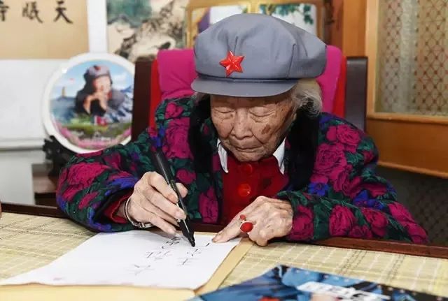 104岁的王定国在纸上写下“长征万岁”。(中国妇女报·中国妇女网记者 徐建军/摄)