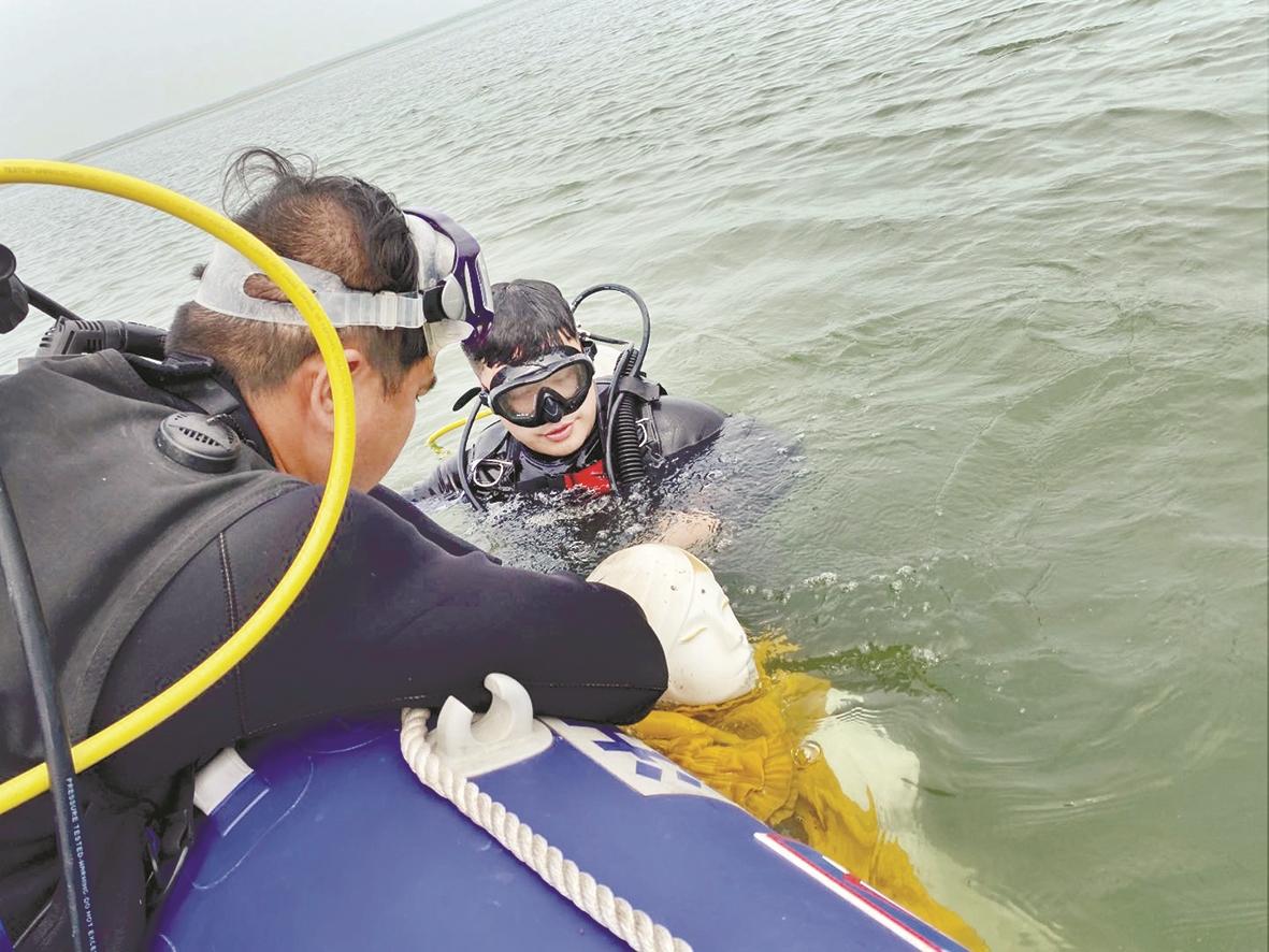 ◀潜喵救援队队员演练水中救援