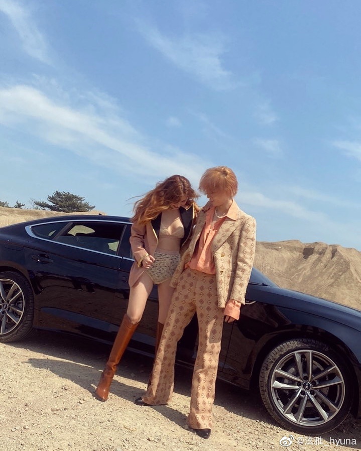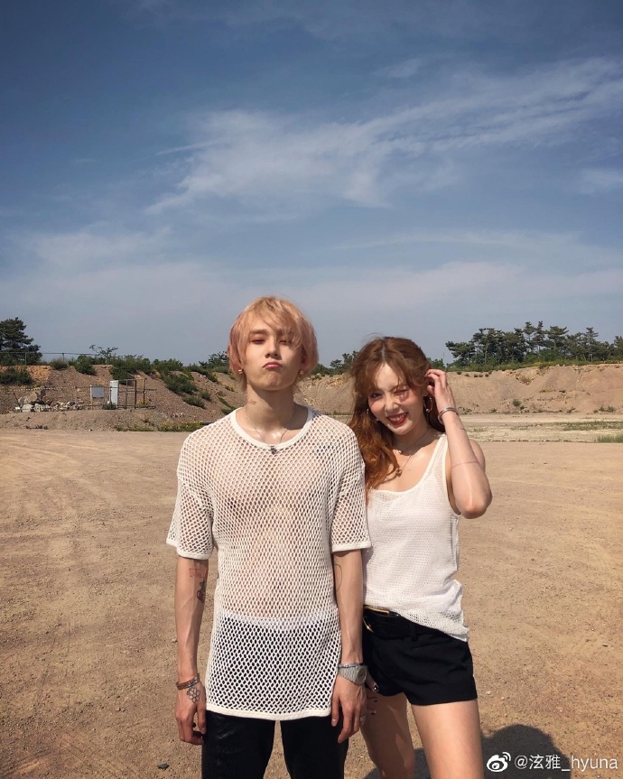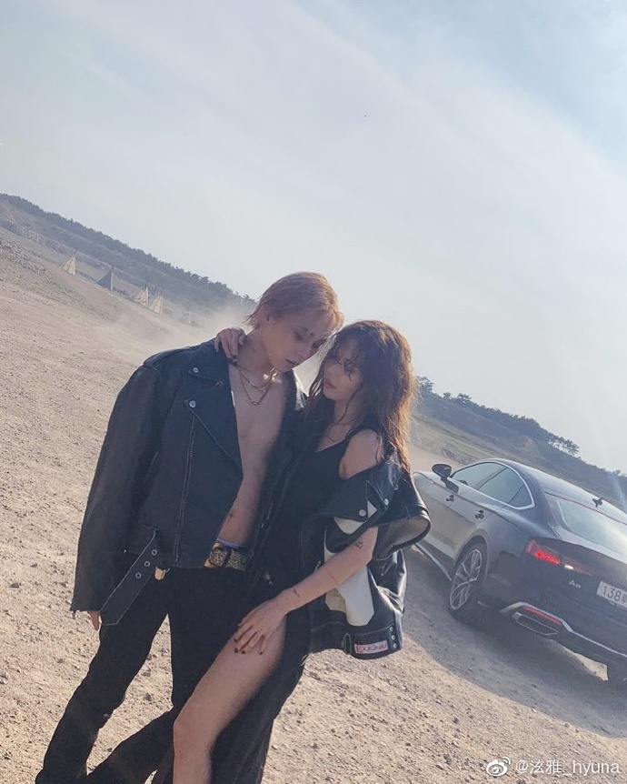 6月9日,泫雅一连串发好几条微博分享与男友金晓钟的户外恩爱合照,照片中泫雅挑战大胆穿搭,还与男友穿白色网格及黑色系皮衣情侣装,两人相拥对镜,甜蜜十足。