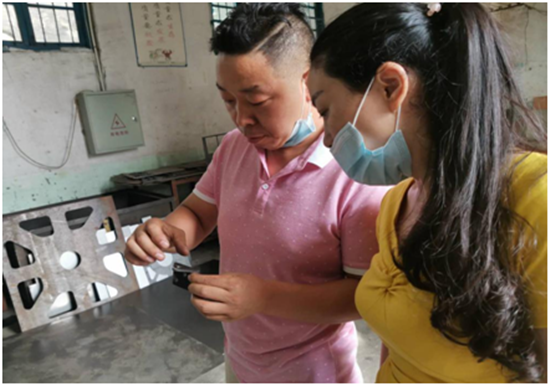 机械厂负责人谢远花与技术员研究新产品开发。 通讯员供图