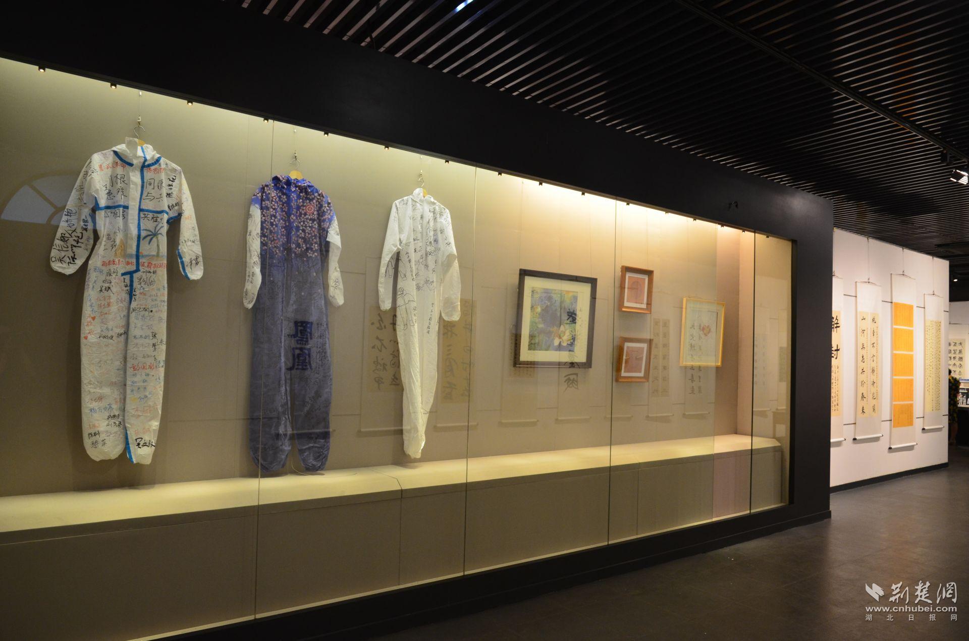 展出防护服3件,有武汉志愿者雷春莉设计的雷神山医护及志愿者签名的樱花防护服、绘有“八段锦”体操图的广东援鄂医疗队队员签名的防护服、武汉火神山医院徐迪雄将军及宋彩萍主任等亲笔签名的樱花防护服。