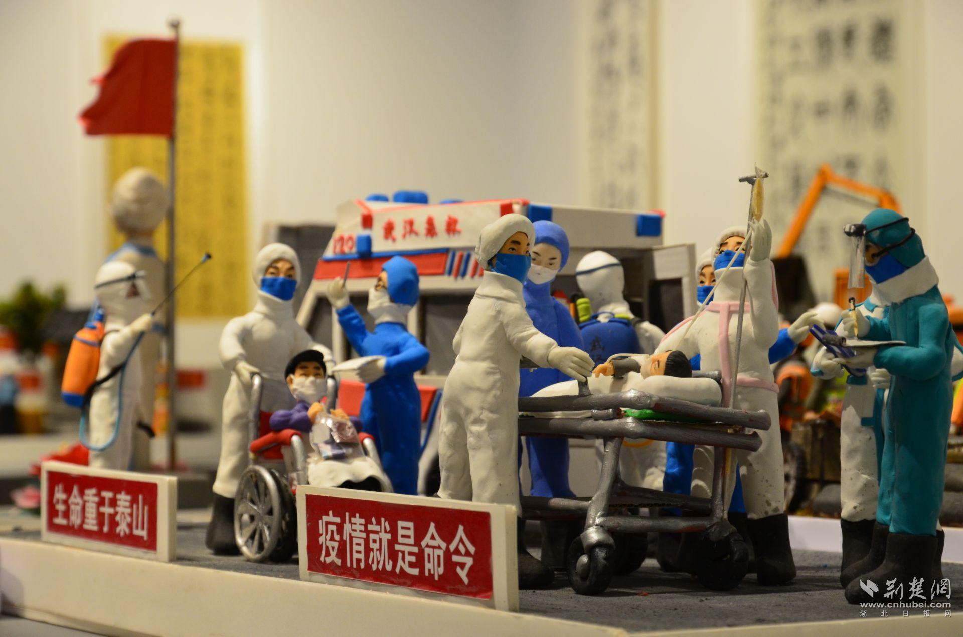 展出面塑作品8幅,分别为《钟南山医疗团队》《国旗下的英雄》《疫情下的生命线》《特战救援》《群防群控》《居家盼春》《疫去春来》《湖北复工复产》,由中国面塑盆景景观艺术发明人、国家非物质文化遗产传承人、山东省临清市面塑艺术家陶玉洁单独创作完成。