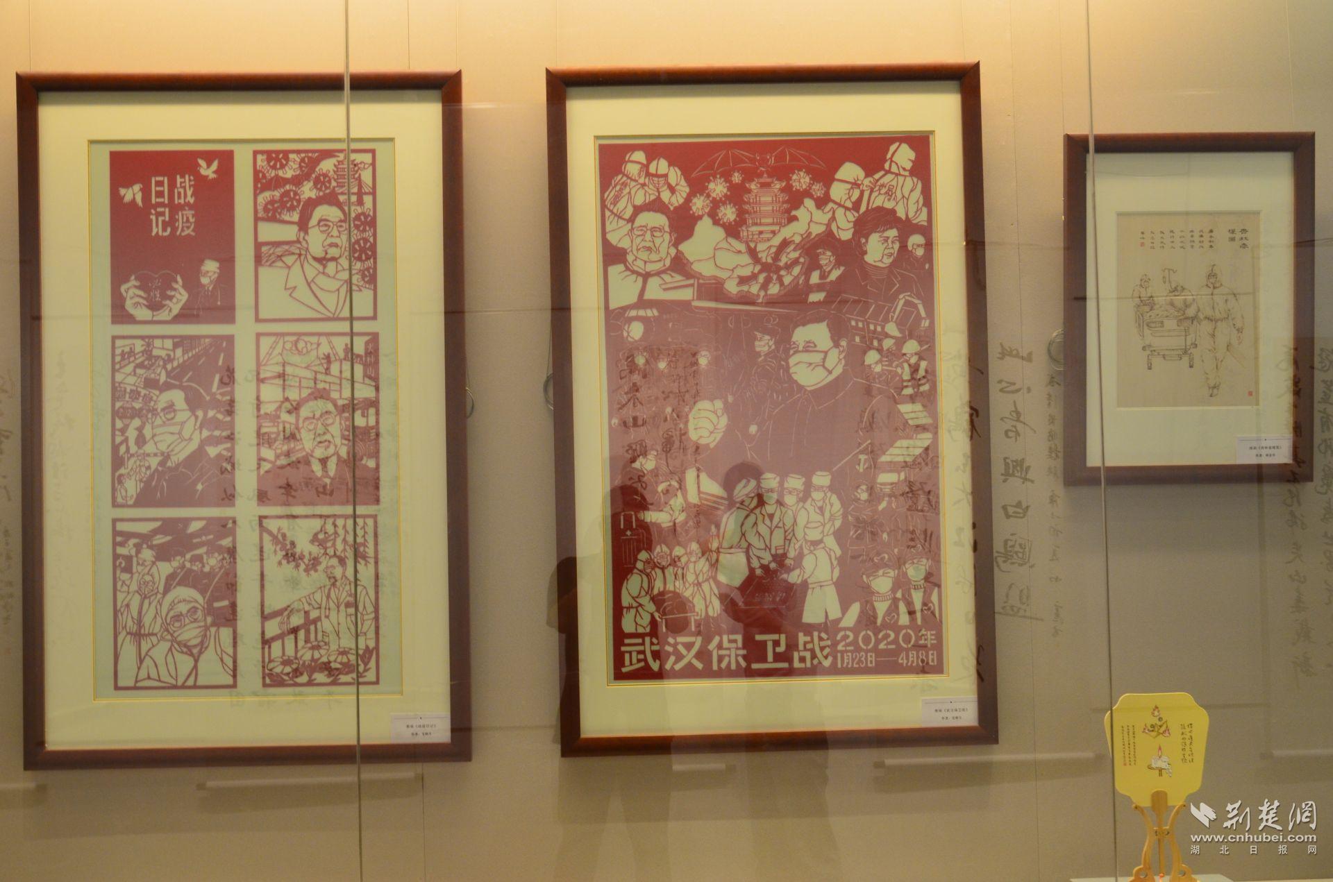 展出剪纸作品2件,分别为《战疫日记》和《武汉保卫战》,作者是武汉剪纸市级非物质文化遗产传承人毛明月。疫情暴发后,毛明月先后创作了26幅有关抗疫主题的作品,他希望借助非遗剪纸作品,把人们抗击疫情的信心传递出来,鼓舞大家。
