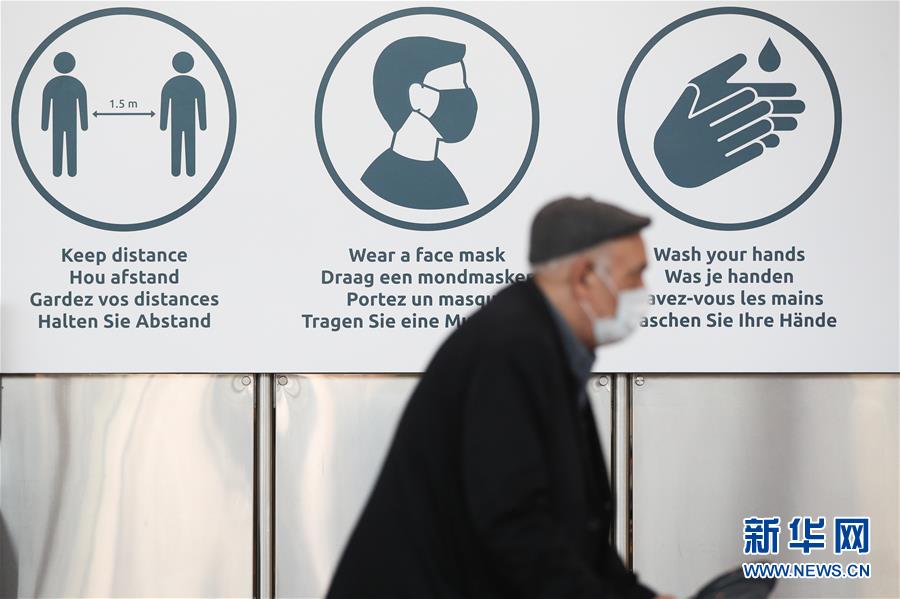 6月15日,在比利时布鲁塞尔机场出发大厅,一名旅客经过新冠疫情防控标识牌。 比利时15日起向欧盟和申根区国家以及英国恢复开放边境。 新华社记者郑焕松摄