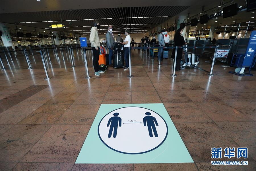6月15日,旅客在比利时布鲁塞尔机场出发大厅办理登机手续,地面上贴着保持距离的标识。 比利时15日起向欧盟和申根区国家以及英国恢复开放边境。 新华社记者郑焕松摄