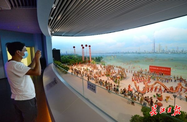 游客在拍摄横渡长江微缩景观。