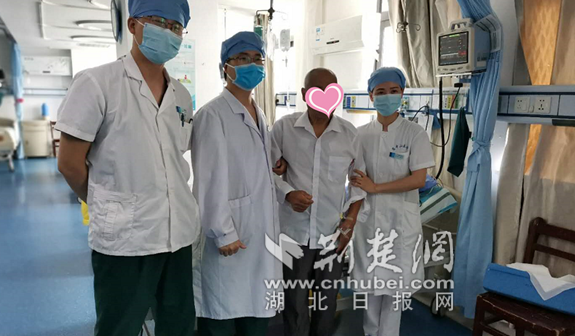 荆楚网客户端-荆楚网消息(记者黄涛 通讯员 贝兰、韩丹青、曾左宽)17日,在湖北省第三人民医院(湖北省中山医院)神经内科二病区,来自荆州的赵爹爹在即将出院之际,不停地与每一位医务人员握手、作揖,激动地向大家表示感谢。谁能想到,十余天前的赵爹爹可不是这样,那时的他呈昏睡状、右侧肢体完全瘫痪。