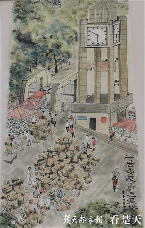 楚天都市报6月19日讯(记者 陆缘 通讯员 江清湲 史雅琴)画面中,社区门口堆着小山般的各类物资,天空下着阴雨,社区工作人员和红马甲志愿者忙碌穿梭为居民分发物资,与钟楼上的钟表争分夺秒。近日,武汉市江岸区百步亭社区举行了“同心抗‘疫’,百步亭人坚定前行”主题书画展,展出百步亭居民自发创作的72幅书法、绘画作品。居民黄世礼创作的《二居委会疫情送温馨》让参观的社区工作人员备受感动。